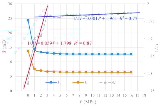 According to the simulation results, both horizontal and vertical permeability decrease with increasing compaction stress. Moreover, the decrease in the lower stress interval is considerably more pronounced compared to the reduction observed in the relatively high stress interval. Within the pressure range of 0 to 3 MPa, the horizontal permeability decreases from 24.31 mD to 13.11 mD (46.07%), and the vertical permeability decreases from 13.72 mD to 6.67 mD (51.38%) (Kv/Kh from 0.56 to 0.52). While within the pressure range of 3 MPa to 16 MPa, the horizontal permeability decreases from 13.11 mD to 12.67 mD (1.81%), and the vertical permeability decreases from 6.67 mD to 6.42 mD (1.82%) (Kv/Kh from 0.52 to 0.51). The reduction in permeability is more significant in the vertical direction compared to the horizontal direction, resulting in an increase in permeability anisotropy. Defining the ratio of vertical to horizontal permeability (Kv/Kh) as the anisotropy index (AI), the value of AI decreases from 0.56 to 0.51 with increasing compaction stress. Meanwhile, the rise of anisotropy also presents a piecewise feature. The increase of 1/AI in the lower stress interval is significantly greater than that in the relatively high stress interval (see Figure 9). To predict the change in anisotropy with compaction stress, a piecewise mathematical model is constructed. Within the pressure range of 0 to 3 MPa, the decline rate of the anisotropy index is 0.059/MPa, while within the pressure range of 3 to 16 MPa, the decline rate of the anisotropy index is 0.001/MPa.
