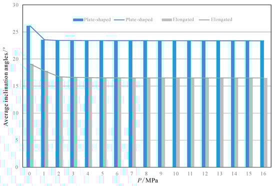 Theoretically, the permeability anisotropy is controlled by the directional arrangement of the plate-shaped particles []. The average inclination angles for elongated and plate-shaped particles are calculated (Figure 10). Within the pressure range of 0 to 2 MPa, the particle position is rotatable in a relatively high porosity, and the compaction stress can drive particle rearrangement. All the non-spherical particles tend to be arranged horizontally to reduce inclination angles. Therefore, at this stage, the average inclination angles for elongated and plate-shaped particles decrease sharply. Nevertheless, as the stress increases, the porosity decreases rapidly, and the particle system forms a tight packing, which limits particle rotation. At this stage, the deceleration in average inclination angles for elongated and plate-shaped particles slows down. The decrease in the inclination angle indicates a more horizontal arrangement of particles, resulting in an enhanced permeability anisotropy. Moreover, the piecewise function of the evolution for inclination angle is also consistent with the variation in permeability anisotropy.