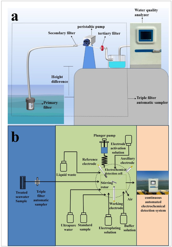 However, considering the challenges, such as sea level variations, seawater composition complexity, and the potential damage from mercury film on internal electrodes, a continuous, automated sampler featuring a multistage filtration system was developed. To ensure the detection system’s sustained, stable, and automated operation, enhancements were made to the sampling mechanism. This apparatus, integrating a peristaltic pump, timer, and filter, enabled the synchronization of detection cycles with pump actions. The manual interface facilitated adjustment of the timer intervals to the desired settings, ensuring precise detection of Pb despite the high levels of impurities in seawater. This configuration allowed for the scheduled, quantitative automatic extraction and filtration of water samples, enabling accurate determination of the Pb content. Each filtration stage had a designated lifespan, and the filter head could be replaced based on the cleanliness of the seawater and duration of use, with the replacement process being both convenient and swift. Together, the water quality analyzer and sampling device constituted a continuous automated electrochemical detection system (CAEDS), as depicted in Figure 1a. The operational procedures of the CAEDS system are depicted in Figure 1b. These steps included drawing 1 mL of washing solution into the plunger pump, injecting it into the washing cell, and diluting it to 5 mL, followed by filtration and introduction of the actual sample into the cell for aeration, stirring, and heating for digestion (step 1). Then, 5 mL of diluted electrolyte was added to the detection cell, along with 1 mL of standard Pb2+ solution for dissolution and enrichment, and the peak height was measured (step 2). Subsequent steps involved cleaning the detection cell with deionized water after standard sample analysis (step 3), filling the detection cell with electrolyte and the digested sample for repeated enrichment and dissolution (step 4), cleaning the cell with deionized water after analyzing the actual sample (step 5), and determining the seawater concentration by comparing the peak values of the standard solution with those of the actual sample (step 6). Our system takes approximately 45 min to complete one Pb detection and can achieve a detection frequency of once per hour throughout the day.