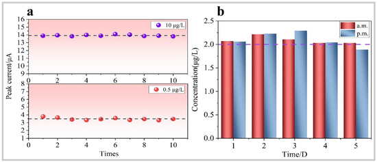 Using the same coated working electrode, ten measurements of 0.5 μg/L and 10 μg/L Pb in standard seawater samples were conducted (a). The CAEDS system was employed to continuously monitor the concentration changes of 2 μg/L Pb over five days, which were conducted twice daily (b).