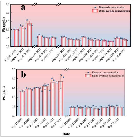 The continuous monitoring of Pb concentration in the surface seawater of the North and South Yellow Seas, China, was carried out utilizing a field monitoring system equipped with a triple filtration mechanism. Figure 4a shows continuous monitoring of Pb in the South Yellow Sea of China from August 13th to 30th, with observations made four times daily at a fixed location. To assess the instrument’s reliability under real-world conditions, scheduled maintenance and calibration were performed on August 16th and 20th. Throughout the monitoring period from the 16th to the 20th, the Pb concentrations remained steady and did not significantly fluctuate. The instrument maintained consistent operation and uninterrupted functionality during this duration, confirming the reliability of our long-term data collection efforts. Compared to other time frames, the elevated Pb concentrations observed in the seawater surface layer between August 13th and 15th could be attributed to typhoons and storms [18]. These weather events, accompanied by heavy precipitation, facilitate Pb emissions into the atmosphere primarily from mining activities. Subsequently, atmospheric aerosols absorb Pb and transport it to the ocean surface through rainfall [19]. Moreover, typhoons can induce substantial oceanic disturbances, such as swells and storms, potentially mobilizing Pb from seafloor sediments into the water column [20,21,22]. The heavy rainfall and storm surges associated with typhoons may augment sediment resuspension, influencing the bioavailability and transport of heavy metals [21,23].