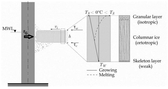 The development of offshore structures capable of enduring ice loading in the Arctic and Subarctic necessitates access to both physical and mechanical data regarding sea ice, which can be independently gathered. Concerning the physical attributes of sea ice, the predominant factor affecting ice loading for structures, whether vertical or sloping, is ice thickness. Various techniques, including satellites, submarines, upward-looking sonars (ULS), and helicopter-borne electromagnetic instruments (HEMs), among others, can measure this dimension of ice thickness. Each method offers differing levels of accuracy based on its unique attributes. For example, satellite measurements cover broad areas but lack precision, whereas HEMs provide ice thickness details solely along the helicopter’s flight path, with accuracy dependent on instrument noise and flying altitude []. Furthermore, the combination of average daily air temperatures from local measurement stations with ice growth models enables the estimation of nearby level ice thickness []. Conversely, the mechanical properties of sea ice, such as flexural strength, uniaxial strength, and ice strength coefficient, can only be obtained through experiments or field and laboratory measurements.