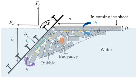 Here, c represents the cohesion of the ice rubble, and ϕ denotes the corresponding friction angle. The load component HT arises from the rotation of the ice block at the slope’s summit, as described by Equation (13).