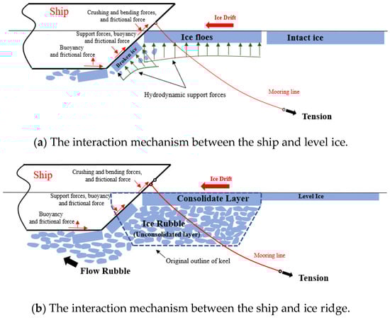 The temporal fluctuations in mooring line tension are intricately tied to the dynamics of ship–ice interactions. Estimating the cumulative ice-induced loads on the vessel during station-keeping involves employing the resistance method. This method, often referenced in the ice mechanics literature [], serves to characterize the comprehensive ice loads arising from the interaction between the vessel and ice and to compute the propulsive force necessary for ships navigating through sea ice []. For stationary vessels, the method substitutes ice drift speed [] for relative ship speed to gauge total mooring loads. The resistance method encompasses the summation of forces originating from two primary mechanisms []: level ice resistance and ridge resistance, depicted in Figure 4.