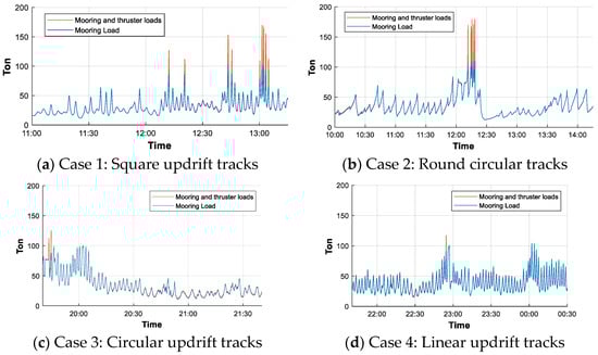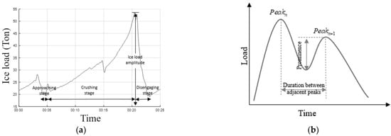 The time series data of measured ice-induced mooring loads typically exhibit a sequence of sharp peak impulses. The process of ice-induced loading is characterized by three distinct stages: approach, crushing, and disengagement. During the full-scale experiments, the ice concentration was exceptionally high, reaching approximately 9.5 out of 10. In cases of peak ice concentration, the approach stage of the ice-induced mooring load is very brief, as depicted in Figure 5a. This three-stage pattern of mooring load persists continuously as the ship hull encounters successive ice edges.