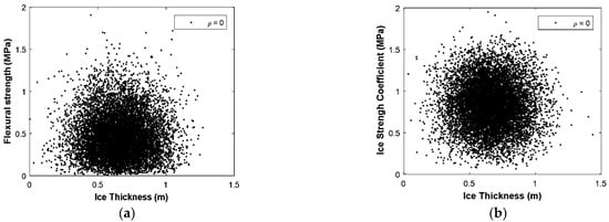The condition of independence among the fundamental variables is characterized by setting the correlation coefficient ρ to zero, which serves as the initial input for the MCS. The scatter plot depicting the independent relationship between ice thickness and flexural strength for sloping structures is depicted in Figure 6a. Similarly, the scatter plot illustrating the independent relationship between ice thickness and the ice strength coefficient for vertical structures is shown in Figure 6b. Subsequently, the study explores the effects of introducing correlations between these variables using the NATAF transformation model.