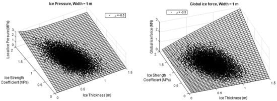 Sea ice properties inherently exhibit significant uncertainty. The wide range between maximum and minimum parameter values used in calculating ice loading suggests that correlations between these parameters—whether high–high, high–low, or low–low—are likely to have a notable impact, a factor addressed in this study. It identified correlations among critical design parameters for both vertical and sloping structures. To integrate this understanding into our probabilistic assessment, it employs multivariate probability density functions with explicit correlation coefficients, alongside MCS techniques. This approach enables us to quantify how these correlations affect computed ice loads as per the ISO standard formulation. To ensure computational robustness, correlation coefficients range from −0.9 to 0.9, encompassing the full spectrum of possible values from strongly negative to strongly positive.