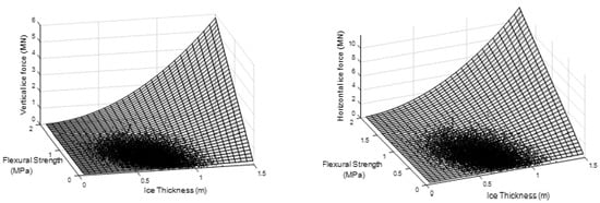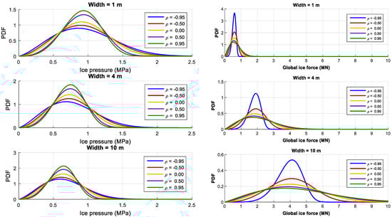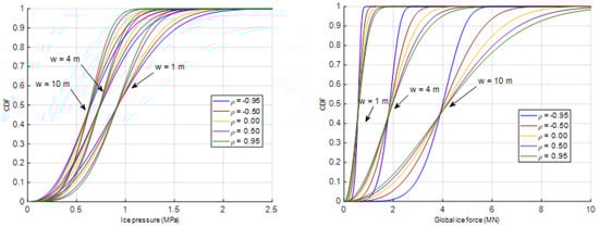 where h is the ice thickness and h1 is a reference thickness. It is typically assigned as 1 m. CR is the ice strength coefficient, w is the width of the structure, n is an empirical coefficient equal to (−0.5 + h/5) for h < 1.0 m and equal to −0.30 for h ≥ 1.0 m, and m is an empirical coefficient equal to −0.16 []. The analysis includes different structural widths, namely 1 m, 4 m, and 10 m. This investigation is part of a probabilistic assessment using Monte Carlo simulation.