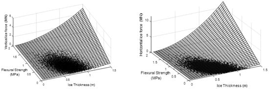 In this section, the outcomes of analyzing ice loads on structures using the ISO standard are presented. The approach to analyzing ice load differs between vertical and sloping structures primarily because the failure mechanisms of sea ice vary between the two cases: crushing mode for vertical structures and flexural mode for sloping structures.