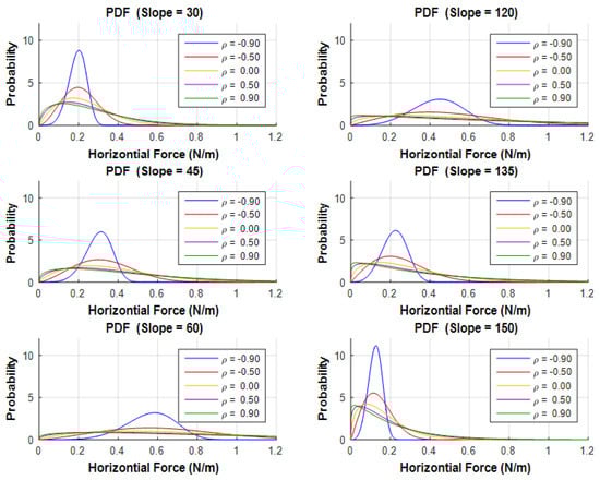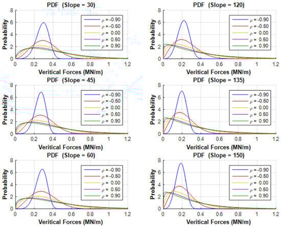 For vertical structures, the parameter xk, representing the ice strength coefficients in Equations (28) and (29), is employed in lieu of the flexural strength of sea ice, xj. The NATAF transformation model remains valid across the entire spectrum of the correlation coefficient (i.e., from −1 to 1). This study investigates the influence of the correlation between key parameters of ice loading on vertical and sloping structures. Five distinct values for the correlation coefficient ρ are utilized: [−0.9, −0.5, 0.0, 0.5, 0.9], encompassing the full range from minimal to maximal values. The extreme correlation coefficient values are confined to −0.9 and 0.9 due to numerical constraints inherent in the transformation process (i.e., the transformation matrix in Equation (33) becomes singular as the absolute value of the correlation coefficient nears 1.0).