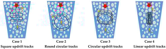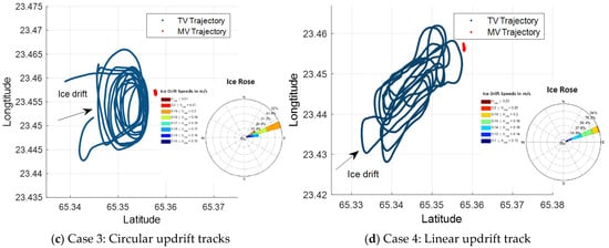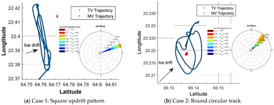 In case 2, where the icebreaker follows a round circular pattern, it covers the entire vicinity around the supply vessel, MV. As a result, the effectiveness of icebreaking in the upstream direction of the ice drift decreases due to the shorter distance over which the sea ice is cut. This reduction in travel distance tends to lower the efficiency of the ice management operation. However, the round circular pattern offers advantages in regions characterized by rapidly changing directions of ice drift.