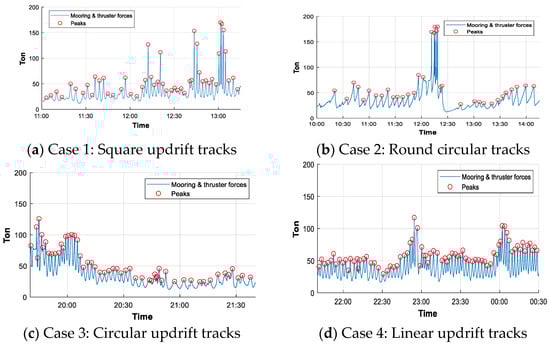 The peaks in mooring line tension are identified using the peaks prominence method implemented in a Matlab 2020 toolbox. This method is based on measuring the shortest vertical distance from each peak to the lowest neighboring valley. Its application helps exclude small peaks resulting from signal noise in the recorded time series. Figure 5b demonstrates a sequence of peak detections using this method.