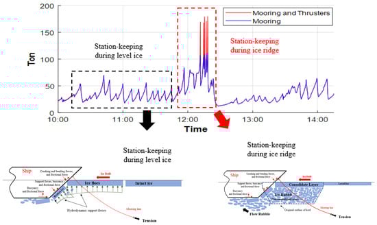 The management of ship and floating offshore structure positioning in cold regions presents formidable challenges. Predicting the stresses imposed on mooring systems by sea ice is particularly difficult due to the complex interplay of sea ice properties and failure mechanisms. These intricate factors introduce significant uncertainty into calculating global ice loads. A comprehensive understanding of ice dynamics, ice–structure interactions, and ship responses to ice loads is crucial for enhancing the planning and execution of ship operations. Such advancements can significantly improve the safety, structural integrity, cost-effectiveness, and operational regularity of maritime activities in icy environments. Precise vessel positioning is critical for a wide range of offshore tasks, including lifting, installation, crew transfers, emergency evacuations, drilling, tanker loading, and subsea equipment maintenance [,].