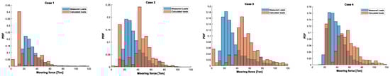 For a three-month return period, considering a reduction factor R corresponding to an operation frequency of 0.375, case 4 (representing the linear updrift scheme) resulted in the highest extreme mooring forces: 320 tons for POT, 318 tons for ACER, and 298 tons for BM. These values exceed both the load cell capacity (150 tons) and the minimum breaking load (MBL = 223 tons) of the steel wire. Conversely, the lowest extreme mooring load occurred in case 3, the circular updrift pattern, yielding estimates of 227 tons for POT, 225 tons for ACER, and 274 tons for BM. To align with the load cell capacity and the steel wire’s minimum breaking load, reduction factors R of approximately 0.0025 and 0.05 are necessary, respectively.