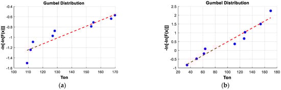 Here, Ttest denotes the duration of a specific full-scale test. In this context, R represents a reduction factor indicating the proportion of time relative to Tday during which the operation is conducted. For estimating extreme values, the Gumbel distribution is commonly utilized as the initial model, primarily because it is assumed to be the appropriate asymptotic distribution for the given scenario, with little additional justification typically provided. The cumulative distribution function (CDF) and the probability density function (PDF) of the Gumbel distribution are expressed by Equations (39) and (40), respectively: