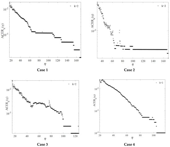 Plot of barrier levels η versus ACER functions εk(η) for k = 2 on the logarithmic scale for different ice management schemes.