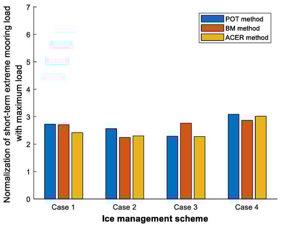 The short-term extreme mooring loads estimated by the POT, ACER, and BM methods for each IM scheme are normalized based on the maximum observed mooring load, as shown in Figure 35. The highest normalized values were observed for case 4, the linear updrift pattern, resulting in 3.1, 3.0, and 2.8 for the POT, ACER, and BM methods, respectively. Typically, the maximum loads derived from simulations of severe environmental conditions are used for mooring system designs. The normalization results suggest a notable increase in long-term extreme values compared to maximum loads observed during short-term operations.