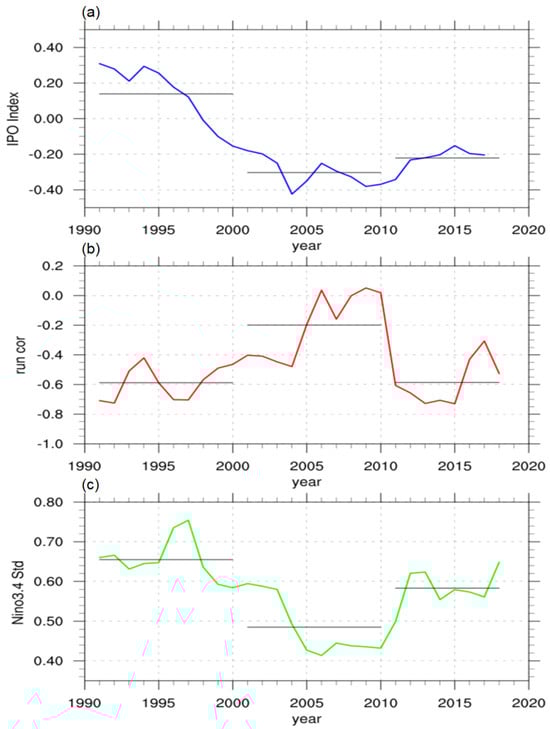 MAM–mean (a) IPO index, (b) correlation coefficients between the SLP averaged over Indonesia and the EEP, and (c) standard deviation of the Niño3.4 index with 10-year moving windows for 1986–2022.