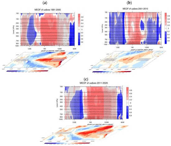Spatial patterns of the leading MEOF mode of atmospheric circulation fields (U-wind and omega; vertical) and the SST (85°E–60°W, 30°S–30°N; horizontal) during boreal spring. (a) The analysis period is 1991–2000, with the leading MEOF mode explaining 37.2% of the total variance. (b) The analysis period is 2001–2010, with the leading MEOF mode explaining 29.5% of the total variance. (c) The analysis period is 2011–2020, with the leading MEOF mode explaining 34.8% of the total variance.