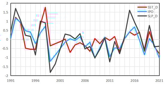 The east–west differences of the SST (red line) and SLP (black line) overlaid the IPO index during boreal spring of 1991–2021.
