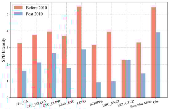 Figure 6 shows the SPB intensity calculated based on the prediction data of 10 models in IRI/CPC. Since all the prediction data we can obtain and test started after 2000, based on the above analysis, we divide the prediction data into two periods, 2001–2010 and 2011–2020, to study the decadal variation of SPBS in the models. It can be seen that except for UCLA-TCD, which has an approximate SPBS of around 2010, all other models exhibit stronger SPBS in the decade before 2010 than in the decade after 2010. This indicates that the decadal variation in the SPBS defined from the perspective of SLP gradient also exists in actual model predictions, which further validates the rationality of this SPB index.