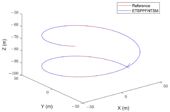 This section evaluates and discusses the performance of the event-triggered sigmoid prescribed performance and nonsingular terminal sliding mode (ETSPPFNTSM) algorithm when applied to the AUV trajectory tracking problem outlined in Section 5.1. The effectiveness of the ETSPPFNTSM algorithm in guiding the AUV along its designated path is visually represented in Figure 4.