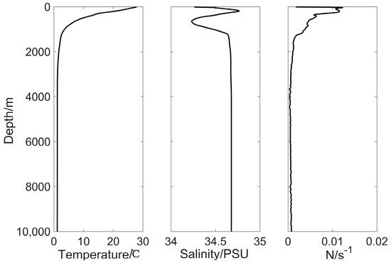 In estimating the ocean stratification, specifically the vertical profile of the buoyancy frequency N, this study utilizes the global reanalysis temperature and salinity datasets from the HYbrid Coordinate Ocean Model (HYCOM, accessible at https://tds.hycom.org/, accessed on 21 August 2024) [31]. Focusing on a grid point within the northern South China Sea characterized by considerable water depth, the vertical profile of the buoyancy frequency was calculated. Acknowledging the presence of a deep-sea trench east of the Luzon Strait, temperature, salinity, and the buoyancy frequency profiles were further interpolated down to a depth of 10,000 m. The outcomes of these calculations are depicted in Figure 1.