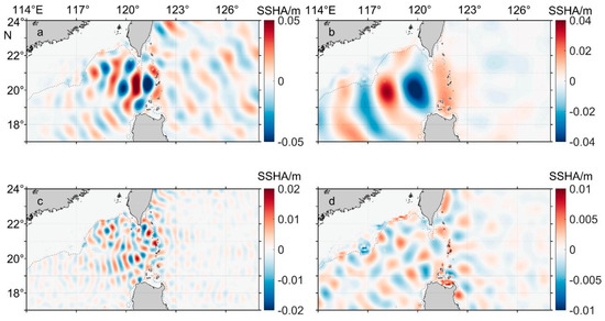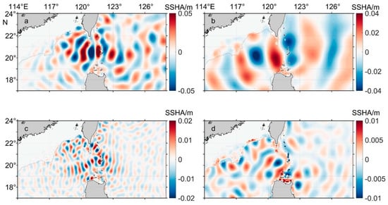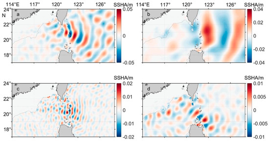 The SSHA snapshot of the mode-1 M2 (a) and K1 (b), internal tides, and mode-2 M2 (c) and K1, (d) internal tides.