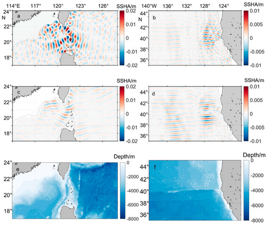 Mode-2 internal tides calculated using the two-dimensional Fourier bandpass filtering method for the Luzon Strait (a) and the northeastern Pacific (b), compared with results obtained using the planar wave fitting technique (c) for the Luzon Strait and (d) for the northeastern Pacific. (e,f) are the topographies of corresponding areas.