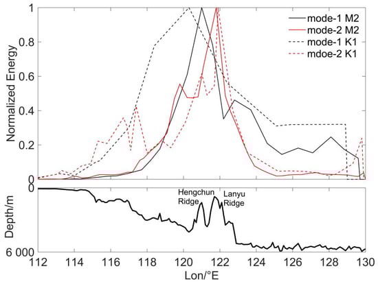 Based on Equation (5), further calculations of the energy attenuation of internal tides in the vicinity of the Luzon Strait were conducted. The averaged energy values for two modes and two constituent tides of the internal tide were computed within the latitudinal range of 19° N to 21° N, with the results depicted in Figure 7. For purposes of straightforward comparison, the internal tide energies were normalized. It is evident that the energy peak for the mode-1 internal tide is situated near the Hengchun Ridge, with the K1 internal tide occurring to the west of the Hengchun Ridge. Conversely, the energy peak for the mode-2 internal tide is found in proximity to the Lanyu Ridge. The dynamical mechanisms underlying these patterns warrant further investigation. Notably, the energy attenuation rate of the mode-2 internal tide across both ridges exceeds that of the mode-1, with the K1 constituent displaying a more pronounced effect. This finding aligns with previous research conclusions [33,34].