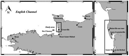 Located in the Normano-Breton Gulf, the wide intertidal zone of the western coast of Cotentin comprises a mixture of sandy, gravelly, sandy–rocky and rocky substrates. The upper beach is composed mainly of sand dunes undergoing intense erosion and sandy intertidal dunes and flats subject to rapid displacement owing to high-energy hydrodynamics in a megatidal environment (tidal range > 12 m during equinoctial spring tide) [15,28,29,30,31]. The upper part of the foreshore from Blainville-sur-Mer in the north to Saint-Martin de Bréhal in the south (Figure 1) is made up of sand, and then a succession of coarse sand and rocky habitats farther seaward [22,27]. The clam sampling sites were located on the intertidal zone about 1–2 km from the tide line, being accessible at each mean spring tide.