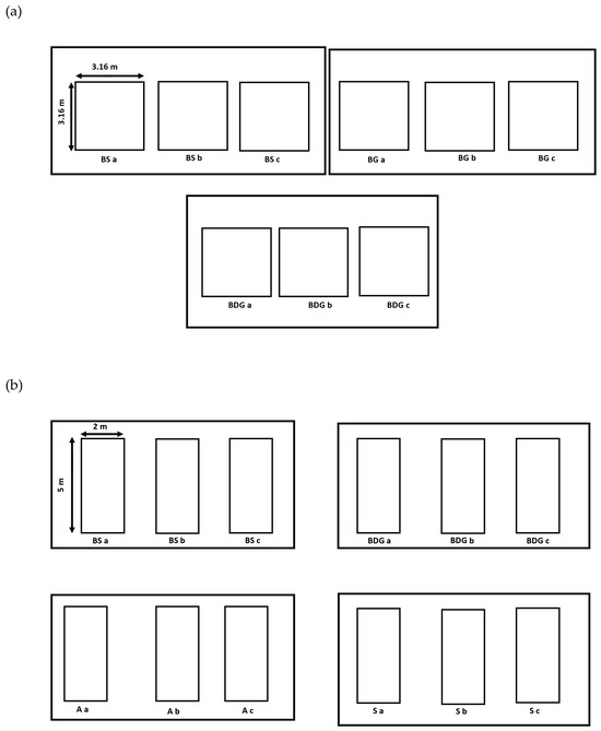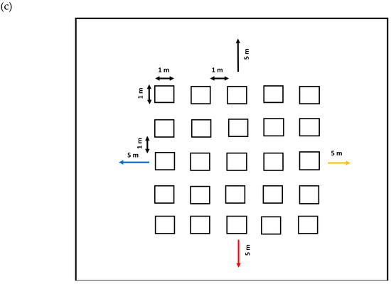 To assess the displacement of adult clams at B in 2014, three sediment types were sampled: sandy habitat (BS), gravelly habitat (BG) and deep gravelly habitat (BDG). For each sediment type, three stations (a, b, and c) with a surface area of 10 m2 (3.16 m × 3.16 m) were randomly delimited and raked at T0 (Figure 2a) [22]. For BS and BDG, the initial (T0) and final (T1) rakings were carried out on 18 February and 18 March versus 3 March (T0) and 31 March (T1) for BG. Before raking at Blainville-sur-Mer, sediment was sampled by core haphazardly from each station in the three sediment types. At the laboratory, the samples were dried in an oven at 60 °C for 24 or 48 h and passed through a column of 32 sieves using a vibrating sieve (60 amplitudes per min) for 15 min.