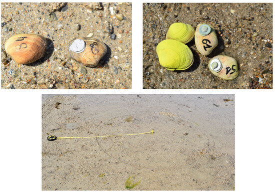 In the present research, we used external tags in inox metal on the surface of the shell to observe the displacement of clams. Several methods have been used such as shell engraving, paints and dyes, glue-on shellfish tags, self-adhesive tags, coded wire tags anchored within the external ligaments of the bivalve, and nylon rivet tags anchored within the respiratory pores [40]. The main problem with external tagging methods is a decline in tag legibility over time and low tag recovery rates due to the abrasion of tags by sediments, particularly during long-term studies [40]. Metallic tags seem to be more efficient and have been used by [32] to track net changes in the positions of intertidal juvenile and adult Donax serra clams (37–67 mm shell length) in a South African dynamic system, with aluminum tags glued to the shells over a 3-month period during the austral fall and winter and their detection with a metal detector. As with [32], the use of aluminum and stainless metal washers on Ruditapes shells is suitable for tracking clam displacement with a metal detector. Moreover, the painting of shells helps in the detection of clams at the end of the experiment such as in 2018; the paint and numbering remains visible after 70 days. This methodology could be used for experiments on other adult bivalves in the future.