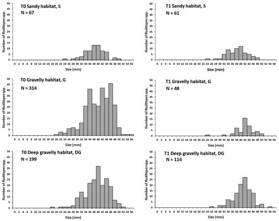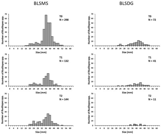 The sizes of the clams at the two sampling dates (Figure 4) showed very small differences, both between the three sites and the two dates. The clams ranged in size from 17.74 mm up to 54.61 mm, with mean sizes between 37.24 and 40.02 mm. At BS, the sizes ranged from 23.70 to 48.65 mm at T0 (mean size = 37.49 ± 4.59 mm) and from 22.05 to 46.32 mm T1 (mean size = 37.24 ± 4.86 mm); at BDG, the sizes ranged from 19.86 to 54.61 mm (mean size = 38.41 ± 5.57 mm) at T0 and from 23.55 to 49.87 mm at T1 (mean size = 40.02 ± 4.47 mm), while, at BDG, the sizes ranged from 17.74 to 50.91 mm (mean size = 39.13 ± 6.25 mm) at T0 and from 24.24 to 52.78 mm at T1 (mean size = 41.04 ± 4.52 mm).