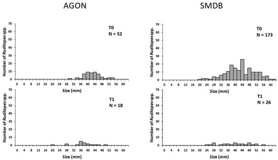 Size of Ruditapes spp. clams harvested from 10 m2 at T0 and T1 at the four Blainville-sur-Mer (BLSMS and BLSMG), Agon-Coutainville (AGON) and Saint-Martin-de-Bréhal (SMDB) sites, and at T2 in the stations of both sites at Blainville-sur-Mer in 2016. Size classes are expressed in mm. N: number of measured clams.