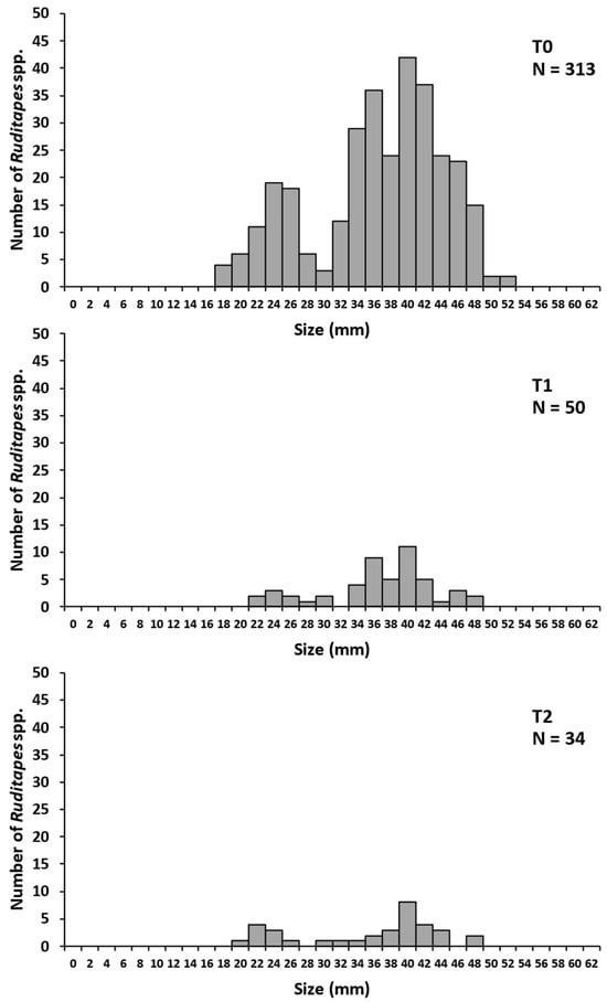 Size of Ruditapes spp. clams harvested from 10 m2 at T0 and T1 at the three Blainville-sur-Mer sites in 2014. Size classes are expressed in mm. N: number of measured clams.