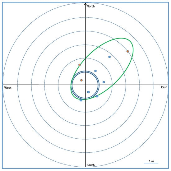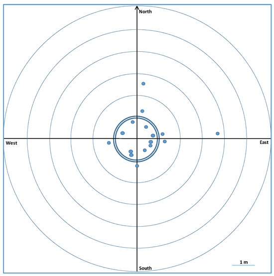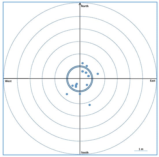 At the A site (Figure 9), on 7 August 2017 after 54 days, a total of 95 live marked clams were found: 79 on the circle, 15 at a distance ≤ 2 m from the centre of the circle and 1 dead clam 12 m from the centre of the circle, without any preferential transport direction and in the absence of strong winds (Supplementary Materials).