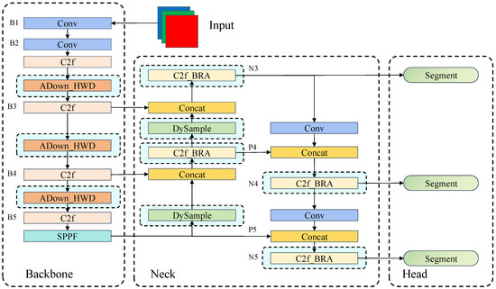 In this paper, we propose a novel network model, CIS, for instance segmentation of corals. The network structure is illustrated in Figure 1. The CIS network model demonstrates superior precision, a lower parameter count, and accelerated detection speeds compared to the YOLOv8 network model. The architecture of the CIS network model is elegantly divided into three main components: the backbone network, the neck network, and the head network. The process begins with the image entering the convolutional (Conv) layer for preliminary feature extraction. Subsequently, the image undergoes two rounds of down-sampling to generate two distinct scale features, denoted as B1 and B2. B2 is then further downsampled, and the C2f and ADown_HWD modules iteratively enhance features, resulting in the creation of feature maps B3, B4, and B5. The feature map B5 is subsequently channeled through the SPPF module to perform pooling operations at multiple scales, integrating global and local features as the output denoted as P5. P5 then serves as the input for the dynamic upsampling process facilitated by the Dysample module, which expands the feature map dimensions. The upsampled feature map is combined with the B4 feature map from the backbone network through a Concat layer. This combined feature map is subsequently refined by the C2f_BRA module, enhancing the feature representation further. The feature maps are once again processed through a dynamic upsampling module, Dysample, and then concatenated with the B3 feature maps from the backbone network using another Concat layer. These concatenated feature maps are funneled through the C2f_BRA module to produce smaller-scale feature maps, denoted as N3. N3 is then processed through a series of Conv and Concat layers, merging the feature map with the P4 feature map from the neck network. After this integration, the C2f_BRA module is employed to generate a medium-scale feature map, N4. In a similar fashion, the feature map is synthesized with P5 from the backbone network for the final time through Conv and Concat layers. The C2f_BRA module is then utilized to derive the large-scale feature map N5. Ultimately, N3, N4, and N5 are funneled through the segment layer, culminating in the output of the final segmentation result.