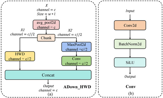 (a) The proposed ADown_HWD module for downsampling; (b) the downsampling module used in YOLOv8.