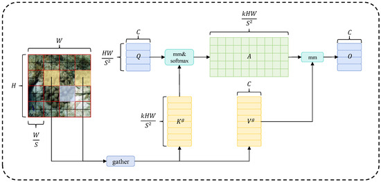 Because the routing regions may be dispersed across the entire feature map, we first need to gather the key and value tensors. and are tensors formed by gathering the key and value. Then, we apply an attention mechanism to and , resulting in the output :