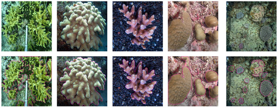 The coral dataset used to train the segmentation model should include images of various coral species to enable the model to capture morphological features of corals under different environmental, lighting, and water conditions. Given the scarcity of publicly available, annotated coral datasets that are suitable for our experiment, particularly those containing a variety of coral species, we undertook a comprehensive data collection and annotation process. Our objective was to assemble a high-quality dataset that would enable the training of accurate and robust models for coral identification and segmentation. To achieve this, we first scoured the internet for existing coral datasets but found them limited in terms of either their diversity, annotation quality, or suitability for our specific experimental needs. Therefore, we resorted to collecting coral images from multiple sources, primarily from publicly available coral datasets such as CoralNet and Coral_Segmentation, as well as keyframes extracted from underwater coral monitoring videos provided by the Guangxi Laboratory on the Study of Coral Reefs in the South China Sea. The final dataset encompasses approximately 20 species of reef corals, predominantly from the genera Acropora, Montipora, Porites, Favia, and Goniastrea. To augment our dataset and enhance the robustness of our model, we adopted data augmentation technology, including flipping, cropping, adjusting brightness, and introducing controlled noise levels to the coral images. This culminated in a coral dataset comprising 2047 high-quality images. The dataset was divided into a training set of 1858 images and a test set of 189 images. To ensure accurate and precise training and testing, we utilized an online annotation platform available at https://universe.roboflow.com (accessed on 1 May 2024) for labeling the coral images. Figure 5 provides an illustrative showcase of a subset of the images from the dataset alongside their corresponding annotations.