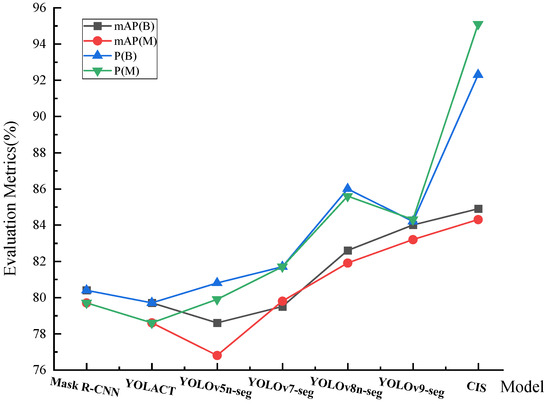 Based on the findings from the comparative experiments, it is evident that the CIS network model significantly outperforms the Mask R-CNN and YOLACT models in terms of precision, mAP50, and especially FPS. Compared with the YOLOv5n-seg model, the CIS network model has a slightly higher number of parameters. However, the mAP50B and mAP50M of the CIS were significantly improved by 6.3% and 7.5%, respectively. Additionally, the FPS is also higher than that of the YOLOv5n-seg model. Compared with YOLOv7-seg, CIS has only slightly lower recall, while all other metrics are higher, and the number of parameters and FPS are significantly better than those of YOLOv7-seg. Compared with the baseline model YOLOv8n-seg, the metrics of the CIS network model, i.e., mAP50B and mAP50M, increased by 2.3% and 2.4%, respectively. Additionally, the number of parameters decreased by 10.1%, and the FPS increased by 10.7%, meeting real-time requirements. Finally, for the latest YOLOv9 network model, CIS is ahead in all the metrics except the recall rate, which is slightly lower. The CIS network model has fewer parameters, and its mAP50B and mAP50M were improved by 0.9% and 1.3%, respectively. Figure 7 shows the comparison between CIS and other network models.