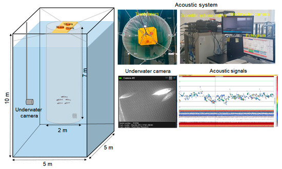The system consisted of a SIMRAD EK80 split-beam scientific echosounder (SIMRAD, Kongsberg Maritime AS, Kongsberg, Norway). The echosounder operated at frequencies of 38 kHz (ES38-10), 70 kHz (ES70-7C), and 120 kHz (ES120-7C), with a transducer utilizing −3 dB beam widths of 10, 7.1, and 7.1° and power outputs of 1500, 750, and 250 W, respectively. The pulse duration and ping rate for all frequencies were set to 0.256 ms and 2 pings/s, respectively. Before the experiments by group, the temperature and salinity of the acoustic tank seawater were measured with a YSI 30M instrument (YSI, Yellow Springs, OH, USA) to determine sound speed from April to September 2022 [28]. Additionally, the transducers were calibrated with a 38.1 mm tungsten carbonate standard sphere [29].