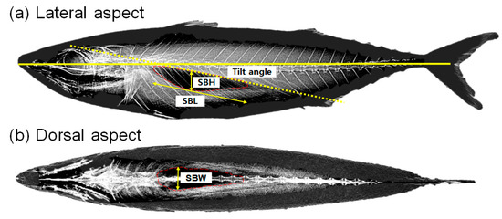 To investigate swimbladder morphology of the chub mackerel used in the TS experiment, samples were subjected to X-ray imaging. After the TS experiment, the samples were measured for FL (cm) and W (g), and then rapidly frozen in a freezer at below −40 °C after placing them in bottles with seawater. The frozen samples were slowly thawed in cold water for 24 h in their bottles to minimize the deformation of the swimbladder’s shape for X-ray imaging [30]. The lateral and dorsal aspects of all individuals used in the TS experiment were photographed using soft X-ray (150 kV, 2mA; SOFTEX M-150W, SOFTECS Corporation, Tokyo, Japan) (Figure 2). Among the 28 chub specimens used in the TS experiment, the swimbladder of one individual (FL = 12.5 cm) from group 2 was damaged and was omitted from analysis. Swimbladder morphology was characterized by tilt angle (SBA), length (SBL), height (SBH), and width (SBW) (Figure 2), and the equivalent radius (αesr = (a × b × c)1/3) was calculated using the semi-major axis (a = SBL/2) from the lateral aspect, the semi-minor axis (b = SBH/2), and the dorsal aspect (c = SBW/2) [27].