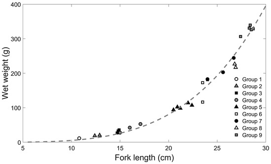 Relationship between fork length (FL, cm) and wet weight (W, g) of nine groups of Scomber japonicus.