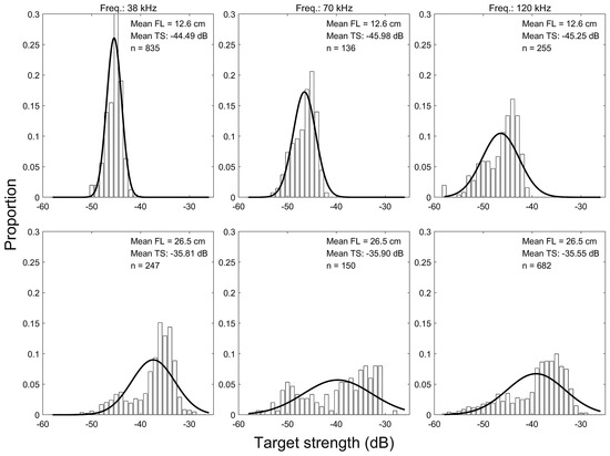 The range of TS for the nine groups of chub mackerel was −63.5 to −28.7 dB at 38 kHz, −64.2 to −27.7 dB at 70 kHz, and −64.1 to −29.2 dB at 120 kHz. TS per group mostly followed a Gaussian distribution (Figure 4). The variation in TS per group was 9.2–32.3 dB at 38 kHz, 9.9–30.9 dB at 70 kHz, and 18.9–33.7 dB at 120 kHz. The range of TS variation per group at 38 kHz and 70 kHz increased with FL (R2 = 0.56–0.94, p > 0.05), while no correlation was observed at 120 kHz between size by FL and TS (R2 = 0.50, p < 0.05). The mean TS per group was −45.8 to −35.8 dB at 38 kHz, −46.6 to −35.9 dB at 70 kHz, and −47.5 to −36.6 dB at 120 kHz, with all frequencies displaying concurrent increases in TS and body size (paired t-test, p < 0.05). Notably, the correlation coefficients of TS by size per frequency showed no significant differences (paired t-test, p > 0.05) (Figure 5).
