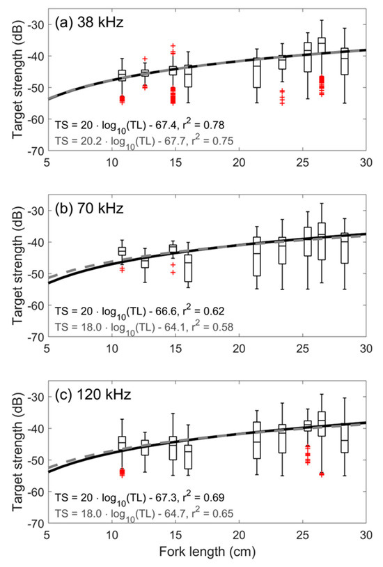 Relationship between TS (dB) and mean FL (cm) of the various fish groups at (a) 38, (b) 70, and (c) 120 kHz. Results of the standard linear regression model (gray dot line) and those obtained with the slope forced to 20 (black dashed line) are also illustrated.