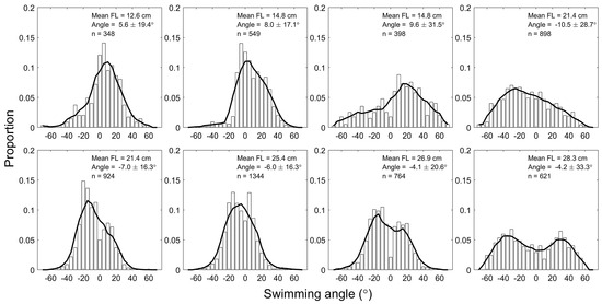 Swimming posture angles of chub mackerel groups showed a wide range of angles from −71.4 to 69.2°, with group means of −10.4 to 9.6° and standard deviations of 16.3–33.3° (Figure 6). The distribution of swimming posture angles was mostly unimodal, with the larger-sized groups 8 and 9 displaying bimodal distributions. The correlation between mean FL and swimming posture angle was negative and differed significantly between groups (R2 = 0.61, paired t-test, p < 0.05).