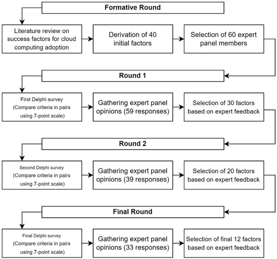In this study, three rounds of Delphi surveys were conducted to derive the success factors for VTS cloud computing adoption. The process began with a comprehensive literature review covering Section 2.1, Section 2.2, Section 2.3 and Section 2.4, which led to the identification of 40 initial factors. These factors encompassed various aspects affecting cloud computing adoption across technological, organizational, environmental, and institutional dimensions.