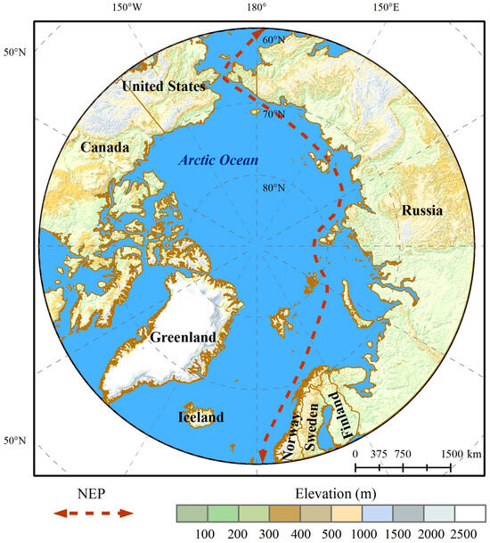 Typically, the Arctic region is divided into three routes: the NEP, the Northwest Passage (NWP), and the Transpolar Sea Route (TSR). Parts of the NEP have lighter ice conditions in the summer, making it more navigable and with a higher number of vessels compared to the NWP and the TSR. The NEP connects East Asia and Europe, and its geographical location holds significant strategic importance for the future development of international shipping. Therefore, this study focuses on all vessels within the scope of the NEP. The geographical coordinates of the study area are 65° N to 90° N, 15° W to 175° E. It includes the Bering Sea, East Siberian Sea, Laptev Sea, Kara Sea, Barents Sea, and Norwegian Sea, as shown in Figure 1. Different sea areas have distinct characteristics and different navigation requirements, making it necessary to study the activity patterns and evolution of vessels within the NEP region.